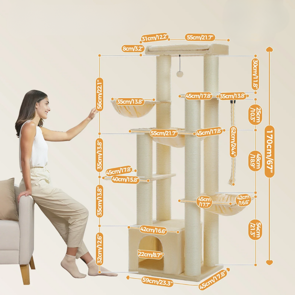 Avec ses 66 pouces de hauteur (environ 168 cm), cet arbre à chat offre sept étages de plaisir et d’exploration pour les chats jusqu’à 10 kg. Idéal pour jouer, s’étirer, grimper ou faire une bonne sieste.