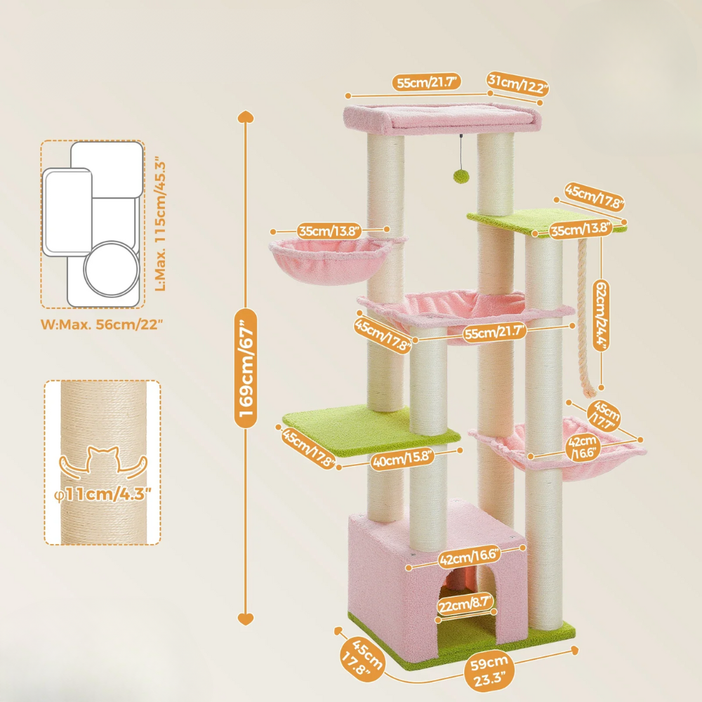 Conçu pour s’adapter à la personnalité de chaque chat – qu’il aime grimper, observer ou se détendre – cet arbre comprend 3 hamacs moelleux, 3 grands perchoirs et une spacieuse maisonnette. Chaque zone de repos est douce et confortable, parfaite pour se détendre ou surveiller son royaume.