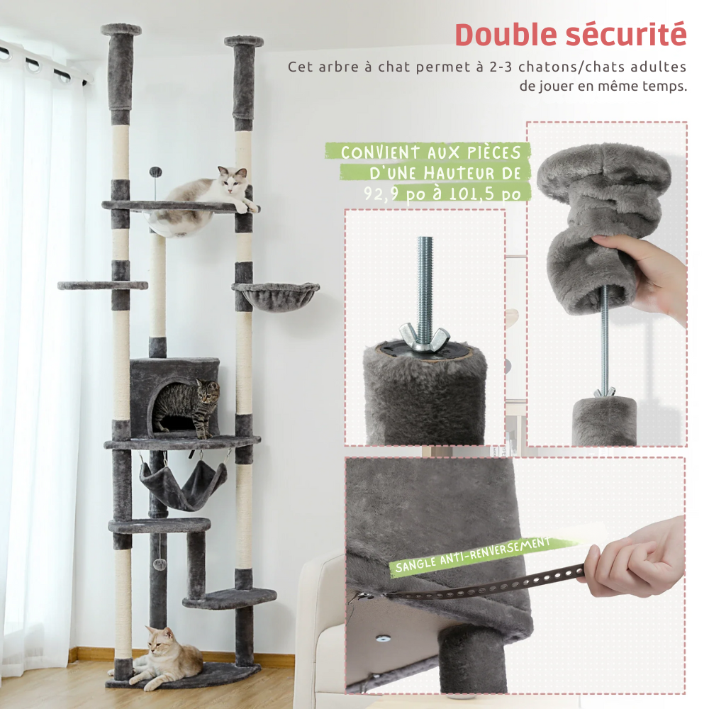 Avec ses 9 poteaux à griffer recouverts de sisal, ses 7 espaces de repos, 2 pompons duveteux et sa structure réglable en hauteur, cet arbre à chat devient leur terrain de jeu préféré. Son design moderne et épuré s’intègre harmonieusement à votre intérieur, transformant chaque coin en un espace de détente féline.
