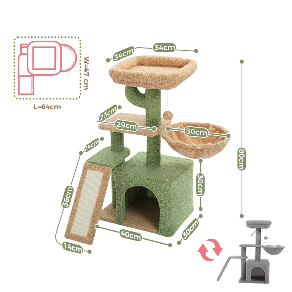 Votre petit compagnon à quatre pattes aura tout ce dont il a besoin : une rampe pour faire ses griffes, un hamac douillet, un petit condo confortable et un perchoir amovible pour les moments où il veut montrer qui est le maître de la maison. C'est l'endroit idéal pour jouer, faire la sieste et grimper !